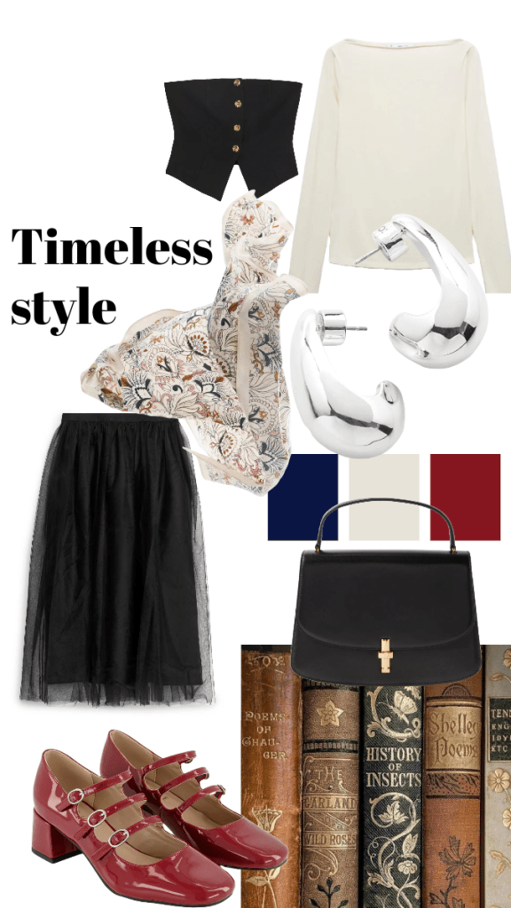Opt for classics colours such as reds, blacks, creams and navys. Timeless style to me does not just focus on one singular era as a means for inspiration. Here I have seeded inspo from 50’s silhouettes in the skirt style and boat neck top, 70’s style with the paisley print on the scarf and 30’s style with the gentle nod to art deco style with the earrings.