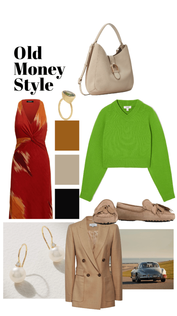 Pops of colour paired with neutral, classic tones always work well. This is how I would put together an ‘old money’ look making sure that I have fun with colours, tones, prints and classic fabrics and cuts such as an a lined dress and a structured leather bag.