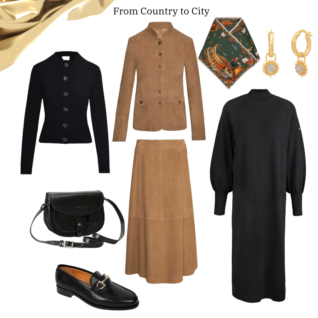 Black cardigan, Suede skirt, Suede jacket, Silk scarf, Black dress, Black loafers, Black saddle bag, Earrings