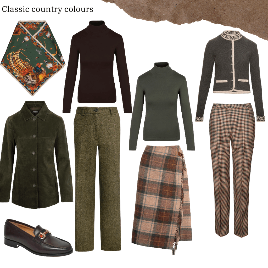 Brown loafers, Silk scarf, Suede jacket, Coffee coloured polo neck, Olive coloured polo neck, Checked fringe skirt, Plaid trousers, Tweed trousers, Oak collared cardigan