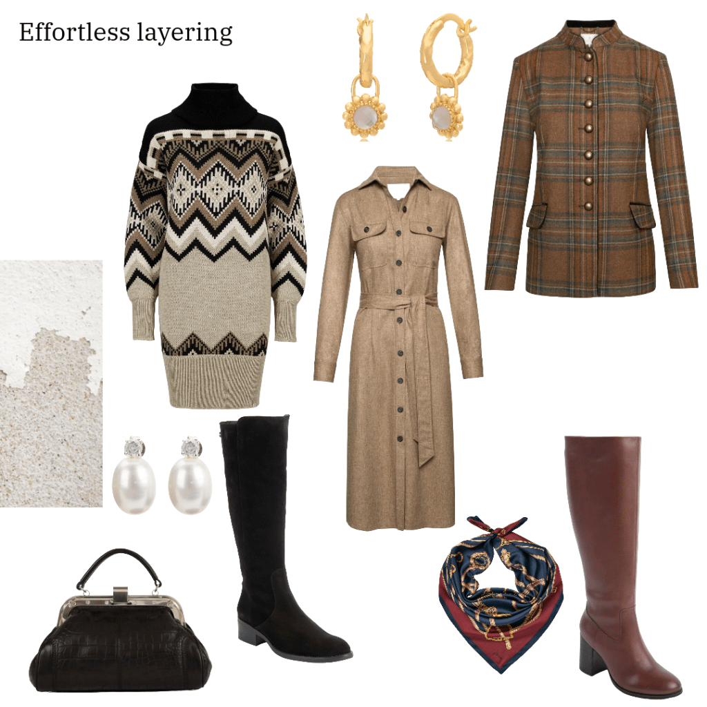 Knitted dress, Black bag, Black long boots , Pearl earrings, Brown boots, Tan dress, Checked jacket, Gold earrings, Neck scarf
