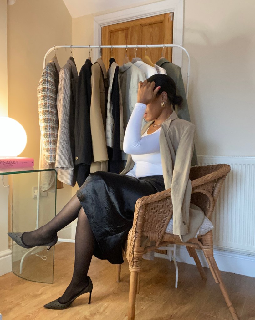 It took me some time to even consider purchasing a satin midi skirt as at the time, it felt all a bit too trendy and I was not feeling very inspired by what I was seeing over socials when it came to styling this item. I can now proudly say that I own two very gorgeous, chic skirts. I had purchased a black one from Max Mara about a year and a half ago and I had also bought a cream Ralph Lauren one maybe 6 months after punching the first one. Another reason why it took me some time to actually go ahead and purchase a couple of skirts for myself, was because I wanted to make sure that I was purchasing for me and not for a trend. I wanted to make sure that if I was going to go ahead and buy this item that I felt inspired enough to intentionally style it up and to make sure it is in a way that really is a true representation of me. For the most part, I have been inspired to styling my satin skirts in a more timeless and chic way, which has always been my go to. Quite recently, I have seen a lot more people over in my Pinterest pin suggestions styling this skirt in what I would consider to be a little more eccentric. They have taken the timelessness of this style and merged it with eccentric styling such as with English heritage colours like Ox blood and racing green skirts and paired it with chunky knits and tweed blazers. This, I really like to see. It inspires me greatly as sometimes it is hard to cross the two in ways that could potentially work.