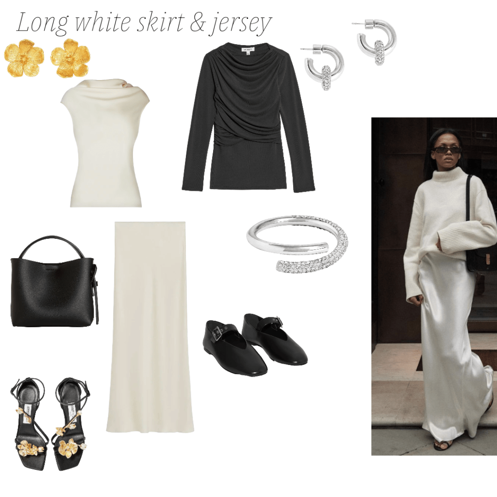 White short sleeve top Philosophy, Gold flower earring Ottoman Hands, White satin skirt Mango, Silver earrings Arket, Silver bracelet Arket, Black shoes COS, Black bag Arket, Black top M&S, Black and gold heels Jimmy Choo