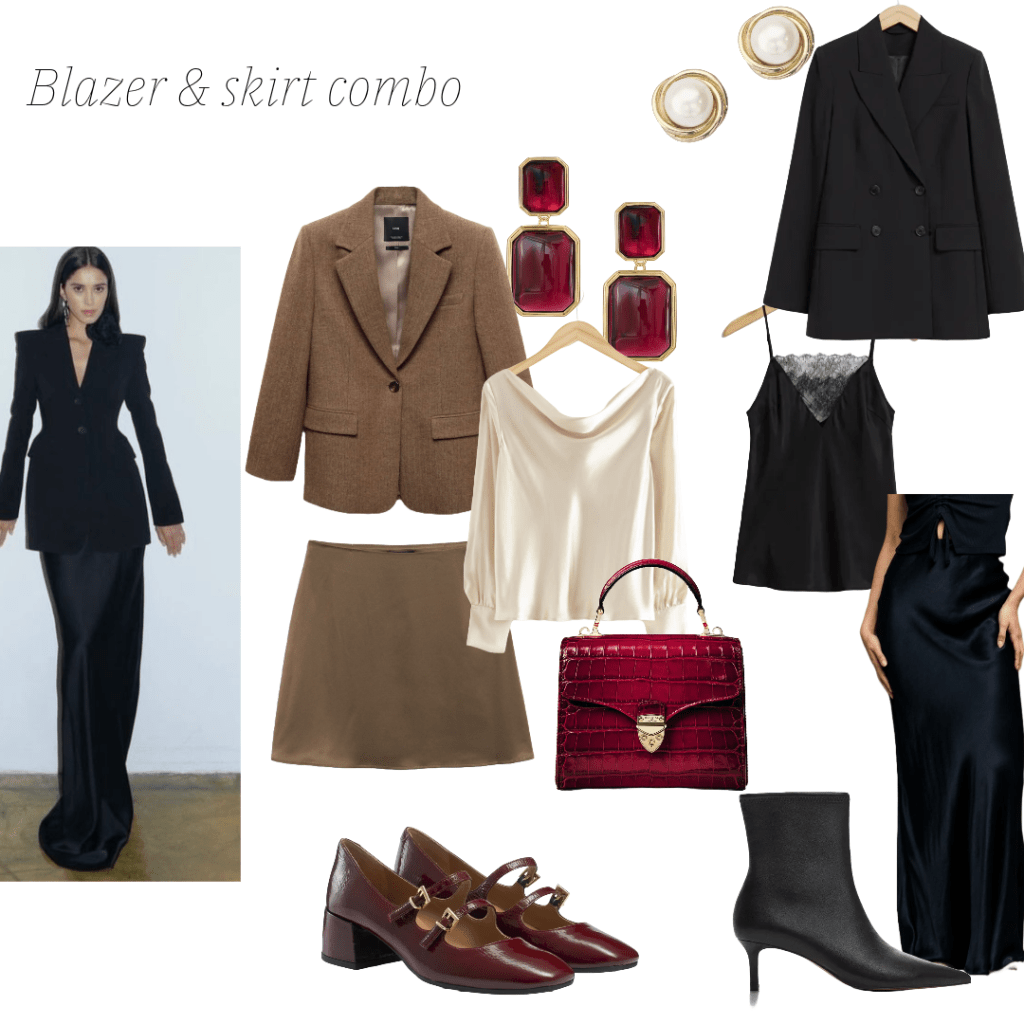 Brown mini skirt Monki, Brown Blazer Mango, Cream blouse &OtherStories, Brown Mary-Janes Russell & Bromley, Red earrings Wolf & Badger, Black satin skirt Nobody’s Child, Black blazer &OtherStories, Black boots Mango, Lace insert top &OtherStories, Red croc effect bag Aspinal of London, Pearl & gold earrings Aspinal of London